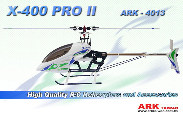 ARK's X-400 Pro II is the ultimate flying machine with unbelievable flying performance. The combination of lightweight aluminum parts and excellent design allows for superb control and swiftness just not found in other helicopters of its class. This Almost-Ready-To-Fly machine will have you up in the air within minutes because only minimal assembly is required. The X-400 Pro's 3-D capabilities are dazzling and will keep you coming back for more.