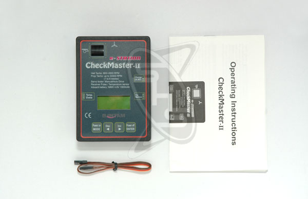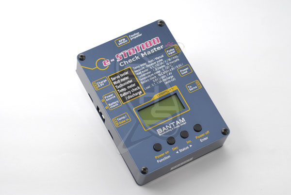 With the Bantam e-Station Checkmaster, you can test any brands of servos for the pulse sent to the receiver, current-load and movement. The power load can also checked with the value of voltage, amp, and watt up to 100A. The Checkmaster also has a very accurate optical tachometer that measures the RPM of a running propeller and battery checker for various types of RX battery.