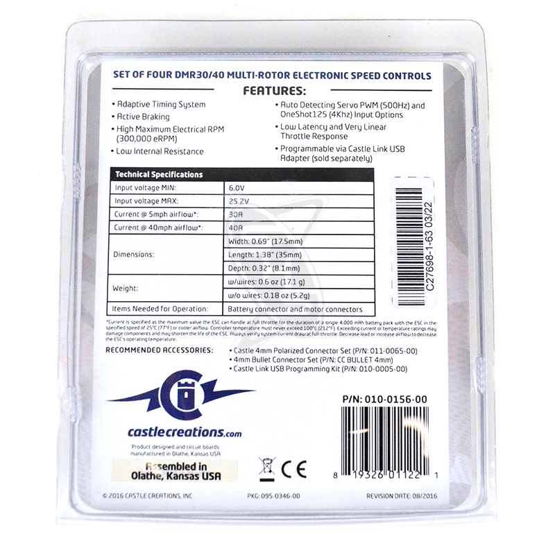 Coupled with our unparalleled 1-year warranty4, lifetime Tier Two "crash warranty", and world-famous technical support, Castle provides confidence and peace of mind that your DMR 30/40 ESC is a smart investment. In this day of “throw-away” electronics, put your multi-rotor investment in a trusted name with a proven track record of support and service.