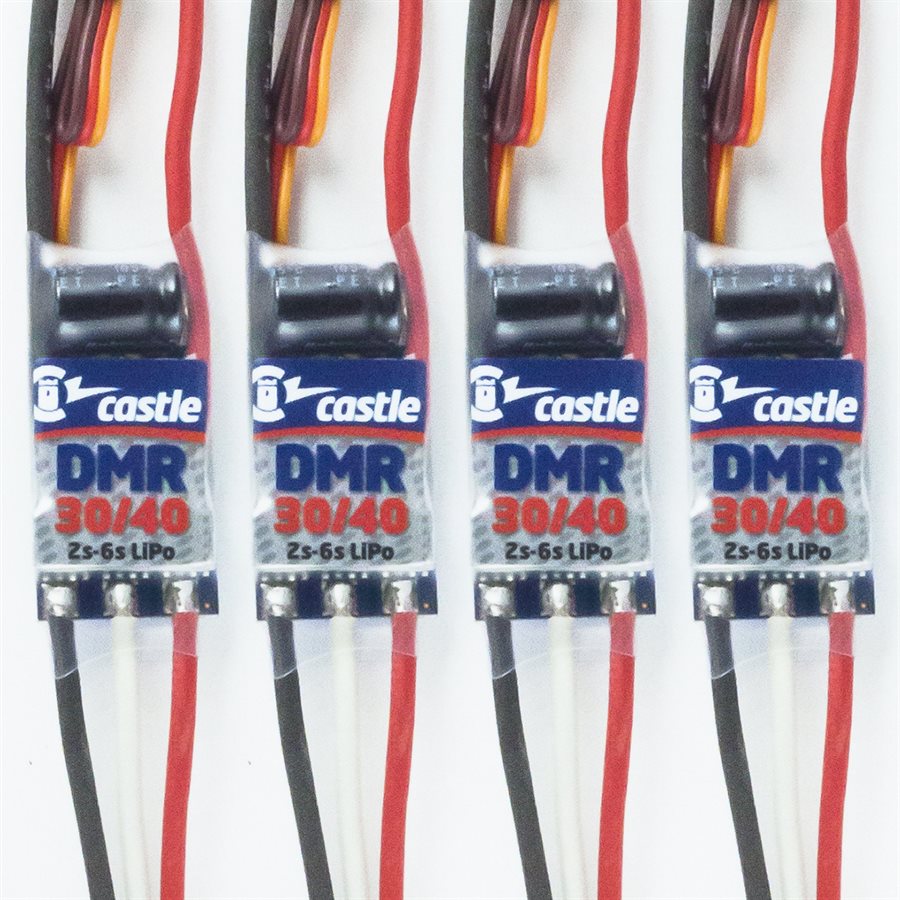 Castle’s new proprietary Adaptive Timing System (ATS)™, released with our V5 firmware, provides a noticeable power difference right out of the box. Castle’s Adaptive Timing System™ technology and ultra-low internal resistance design maximizes efficiency and power output across the entire throttle range. The DMR 30/40 handles up to 25.2V (6S) power too. You’ll not only feel the power increase, but see longer flight times as well.