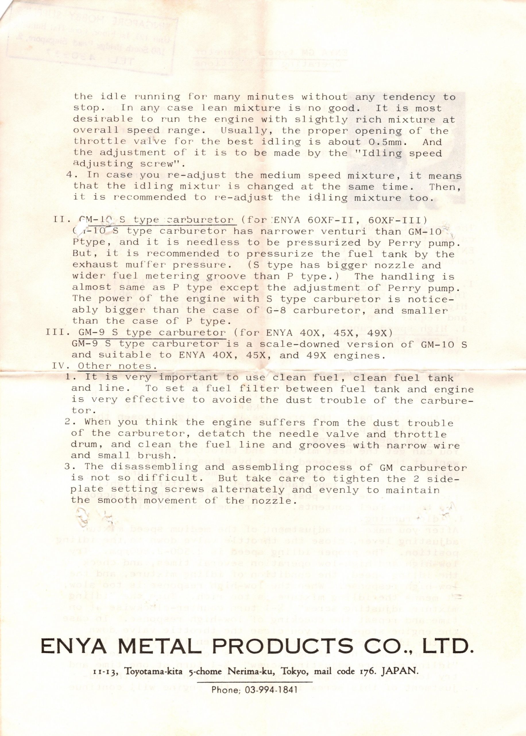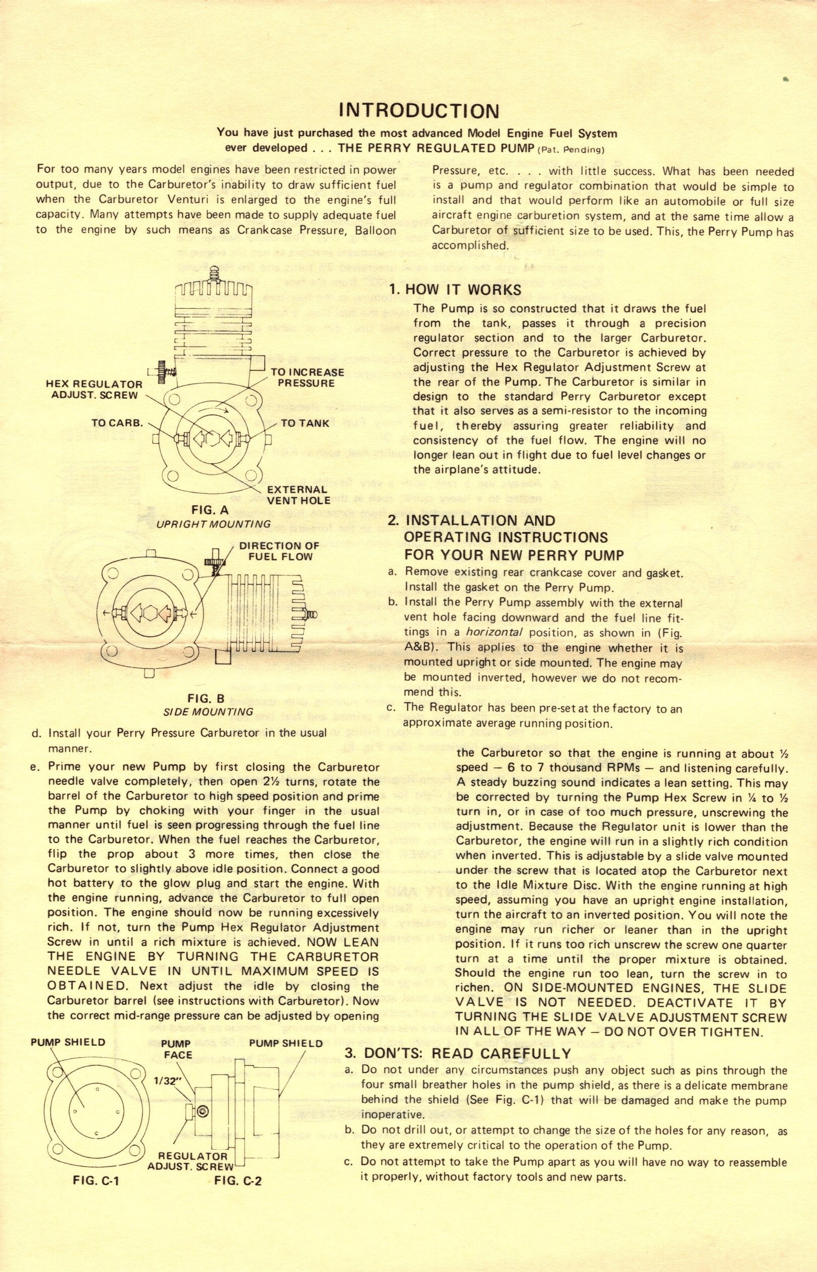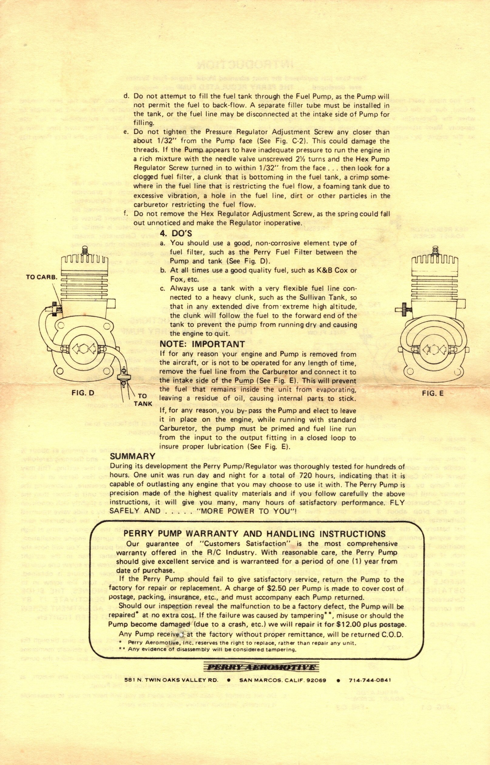 During its development the Perry Pum/regulator was thoroughly tested for hundreds of hours. One unit was run day and night for a total of 720 hours, indicating that it is capable of outlasting any enging that you may choose to use it with. The Perry Pump is precision made of the highest quality materials and if you follow carefully the instructions, it will give you many, many hours of satisfactory performance. FLY SAFELY AND... "MORE POWER TO YOU"!