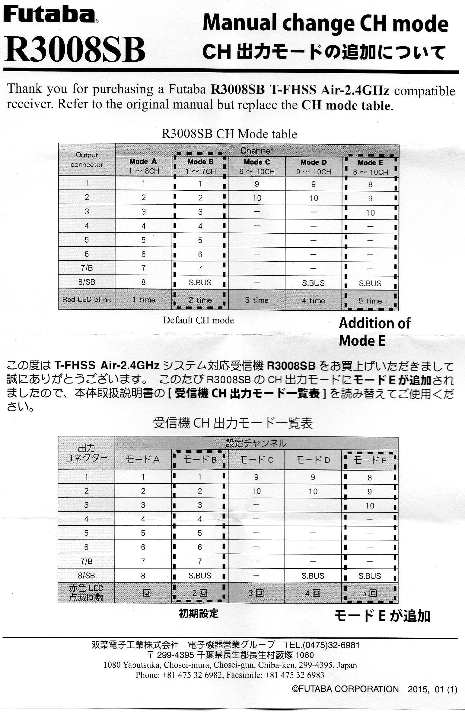 Futaba R3008SB is a bi-directional communication 2.4GHz Futaba compatible with Futaba radio (eg: Futaba 10J) using the S.BUS2, Standard PWM and S.BUS output ports.
