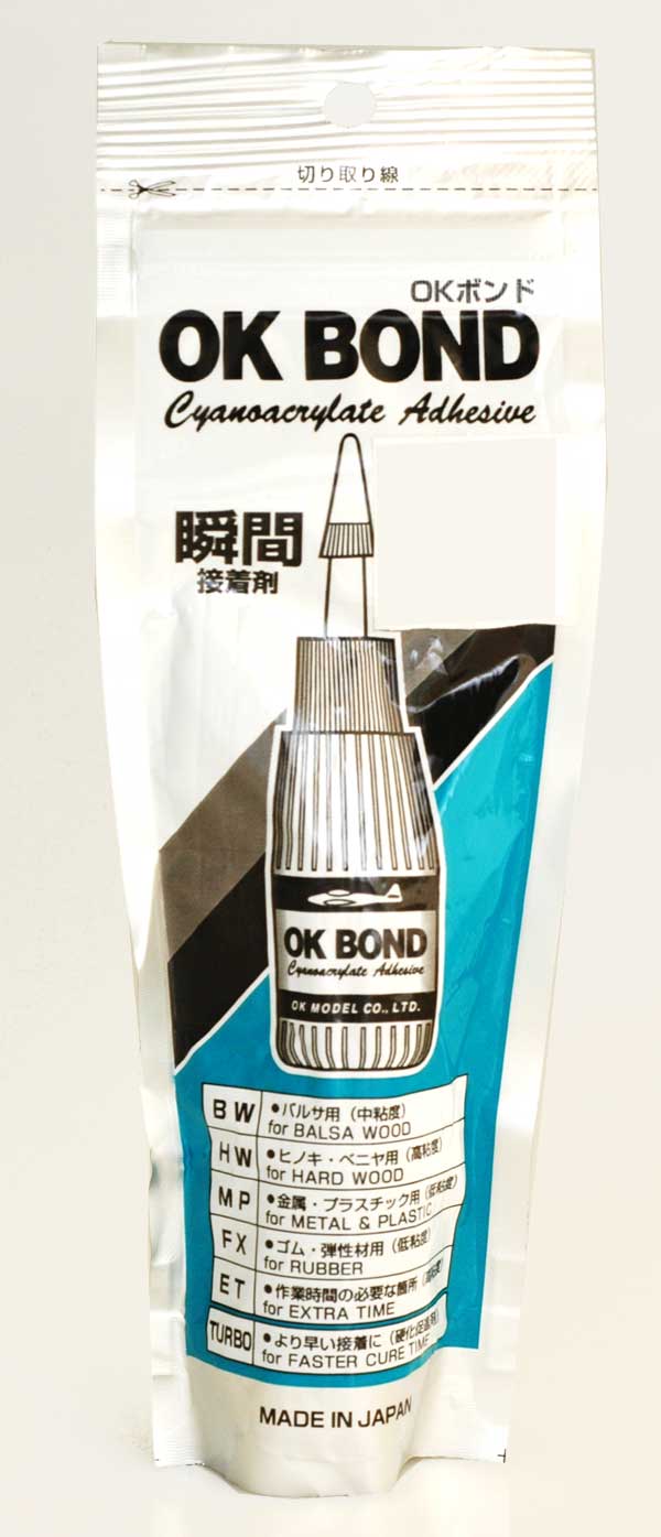 The bond you can trust is what OK Bond CA glue represents. OK Bond will give you the bond that you need for building and assembly. FOAM PRIMER is a CA especially for foam. MP is a thin CA for metal and plastic bonding. BW is medium CA glue for slower cure ideal for balsa wood. HW is thick CA glue for maximum strength ideal for hardwood. OK BOND TURBO is the âactivatorâ used to speed up the cure times.