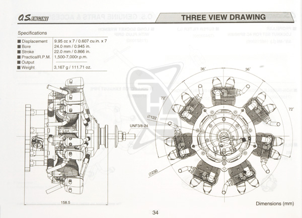 The OS FR7-420 (Sirius 7) is a seven-cylinder radial overhead-valve fourstoke-cycle engine of 70cc displacement. The engine maintains the same features of stress free starting, super smooth idling and high torque power which is always the hallmark of OS large size multi-cylinder engines. With its finely detailed design and outstanding scale appearance and sound, the engine’s quality is second to none.
