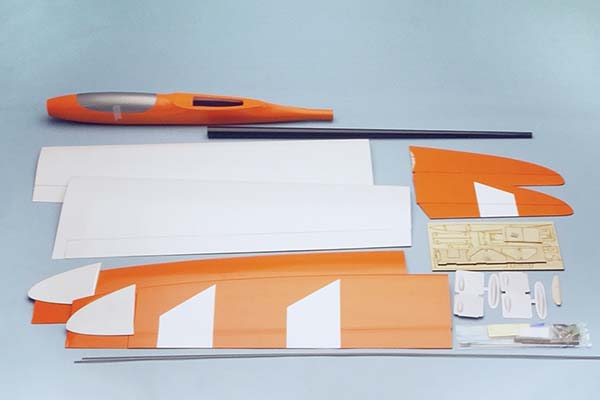 The body is lightweight and strong by combining a glass fiber pod with a carbon taper pipe. The main wing is a balsa rib set balsa ful plank with a