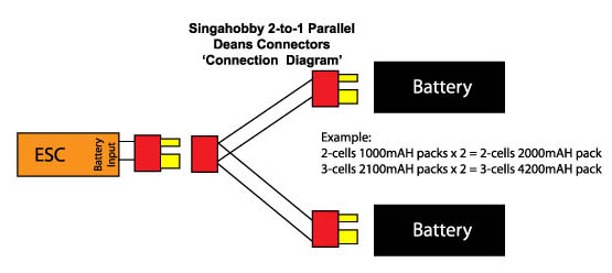 This cable enables a parallel connection of battery packs for increased capacity in powering your aircraft. Below is an illustration of the connection diagram for this connector.