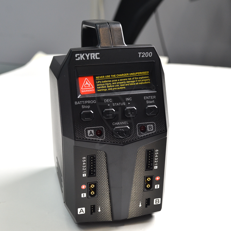SkyRC T200 features the so-called AUTO function that sets the feeding current during the process of charging or discharging. Especially for lithium batteries, it can prevent the overcharging which may lead to an explosion due to the user's fault. It can disconnect the circuit automatically and alarm once detecting any malfunction. All the programs of this product were controlled through two-way linkage and communication, to achieve the maximum safety and minimize the trouble. All the settings can be configured by users!