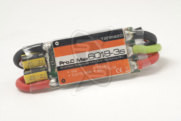 Tahmazo Pro.C Max 6018-3s ESCis easy-to-program and delivers amazing performance for model aircrafts, boats, cars and helicopters. This ESC will deliver a continous current of 60A and maximum current of 70A. Its BEC will deliver a consistent current of 3A(Peak current 5A) at 5.5v.